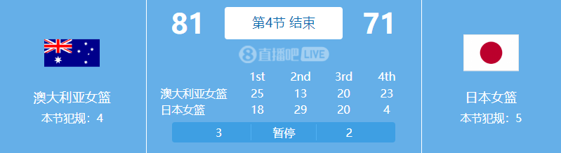 首节比赛,澳大利亚女篮25-18领先7分,随后第二节,日本女篮发力,轰下29-13的攻击波,上半场结束变为领先9分。第三节,双方23-23平,直到最后一节发生了转折点,日本女篮仅仅得到4分,单节输了19分,最终71-81不敌澳大利亚女篮,连续两场遭到逆转。